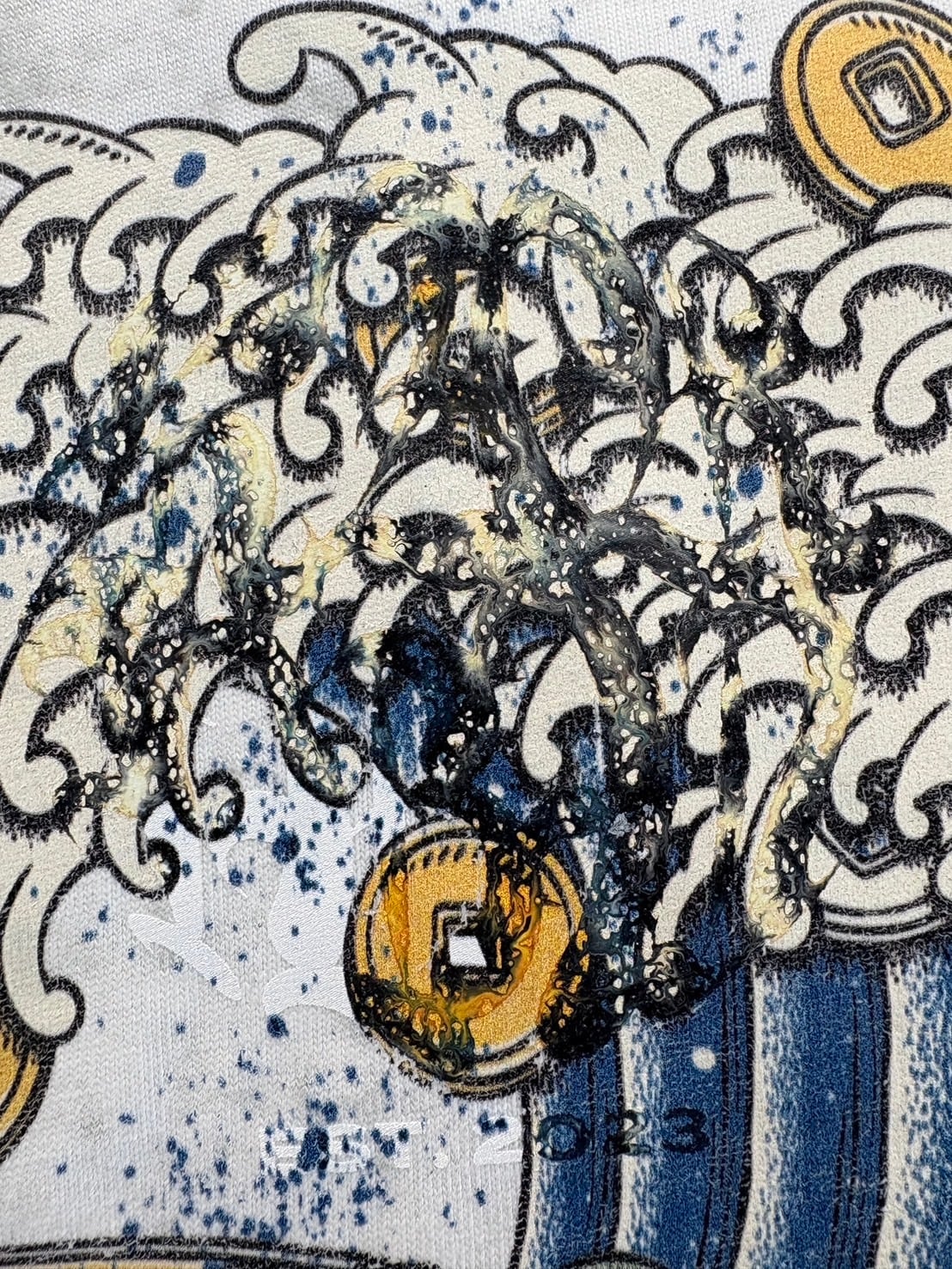 両袖、背面の首元下にメインロゴを同色の白でプリント。ボディは溶かした蝋を散りばめ染めることで蝋部分は染まらず、独特の深い模様を出す"ろうけつ染"技法を使用したポケットティーシャツ。生地感も肉厚でしっかりした作りに。シルエットはややゆったりしております。